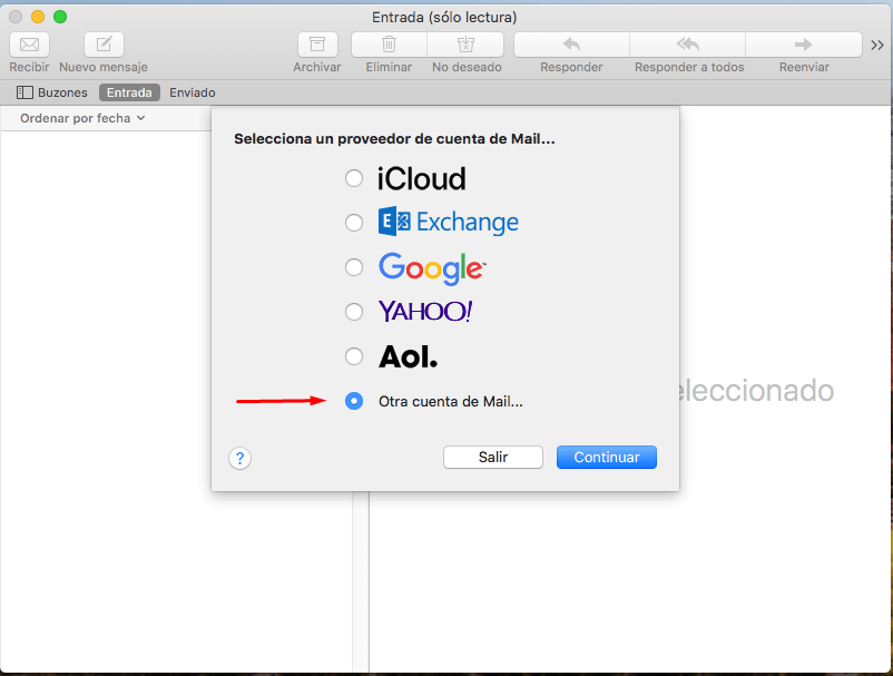 Restaurar el icono predeterminado de mac os x mail dock.. Si no tienes ninguna cuenta configurada, te aparecerá la siguiente pantalla, en la que debes marcar la opción añadir otra cuenta de correo.. Después hacer clic en continuar.